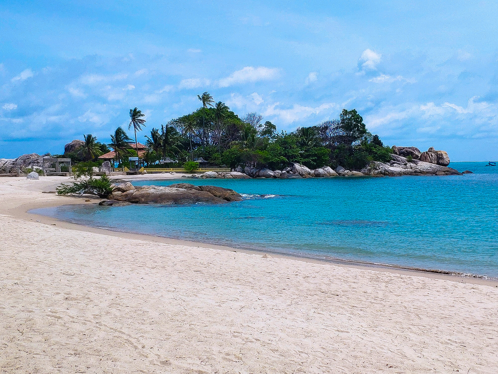 Salah satu spot favorit adalah Rock Island, pulau kecil yang dihubungkan dengan jembatan kayu sepanjang 200 meter. Dari sini, pemandangan pantai semakin dramatis, dengan batu granit sebagai latar belakang foto yang sempurna. Pohon kelapa dan vegetasi tropis menambah kesan surga tersembunyi. Pada sore hari, sunset di pantai ini menjadi momen magis, dengan cahaya oranye memantul di air dan batu.