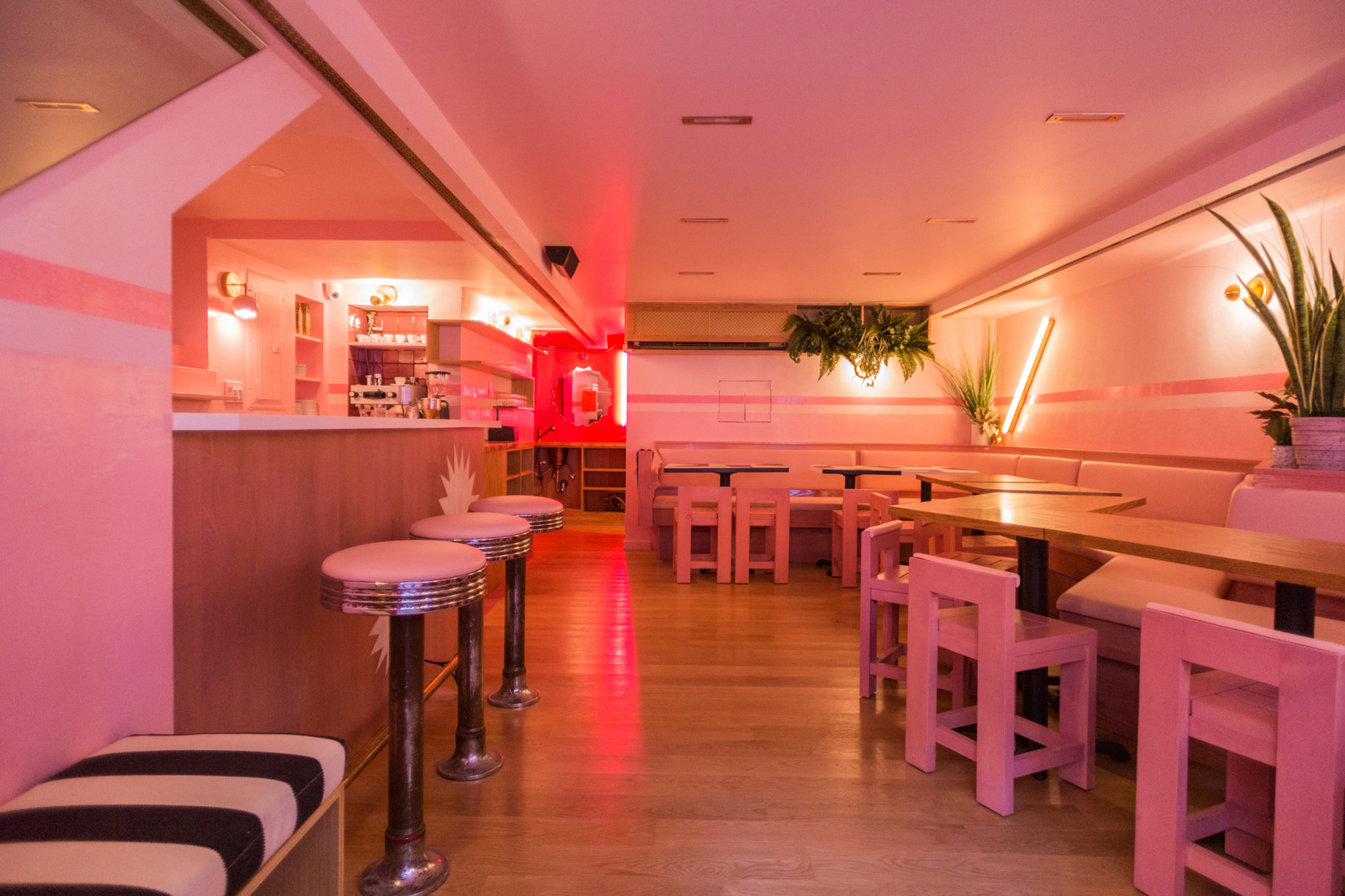 Semua elemen di Pietro Nolita berteriak “pink”: Dinding bubblegum, kursi velvet merah muda, lampu neon vintage, dan bahkan elemen makanan berwarna pink subtle. Vibe-nya cozy 50s bar/eatery, campur Milan sophistication dengan NYC raw energy—sempurna untuk date night, birthday pink-themed, atau after-work drinks. Kapasitas 50–60 orang, meja dekat-dekat, bikin suasana intim tapi ramai. Musik jazz lembut dan lighting hangat bikin malam terasa magis. Di 2025, restoran ini sering pakai untuk event seperti Mean Girls party atau private dinner, dengan dekorasi tambahan glitter dan pink props.